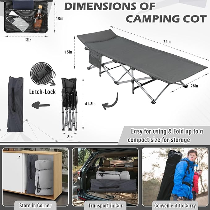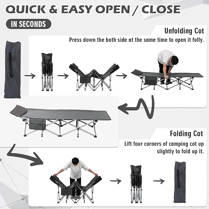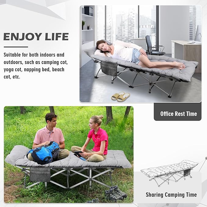 • Convenient & Wide Usage: Our folding camping cot with mattress for adults is lightweight, it is suitable for a variety of outdoors, camping, picnic, tenting, etc, and also for indoors, office lunch break, home guests. We also design convenient side storage bag next the bed, you can store or use things within reach, such as phones, magazines, sun glasses, books, etc. In addition, it also has carry bag, you can carry it anywhere, or store it, not take up much space, as long as it is placed in a corner.