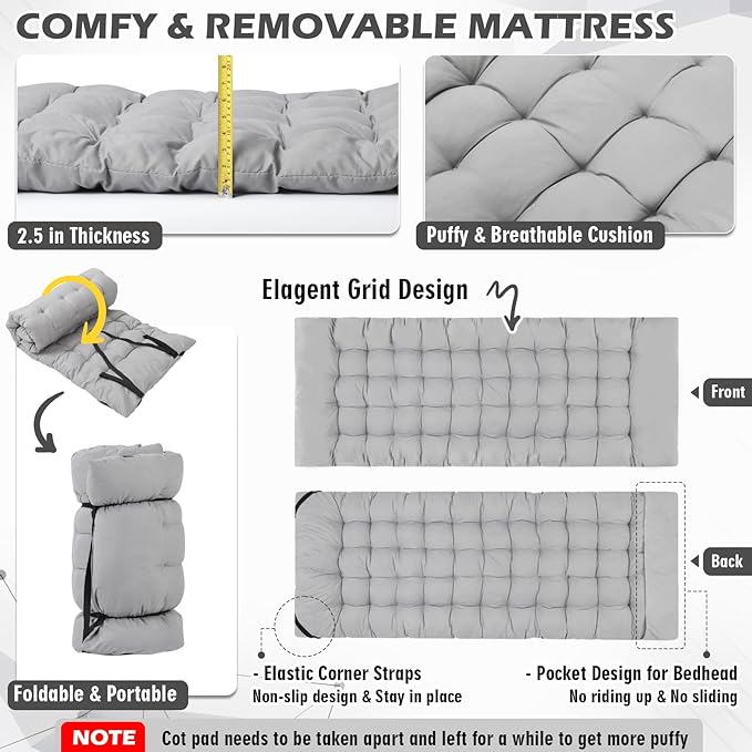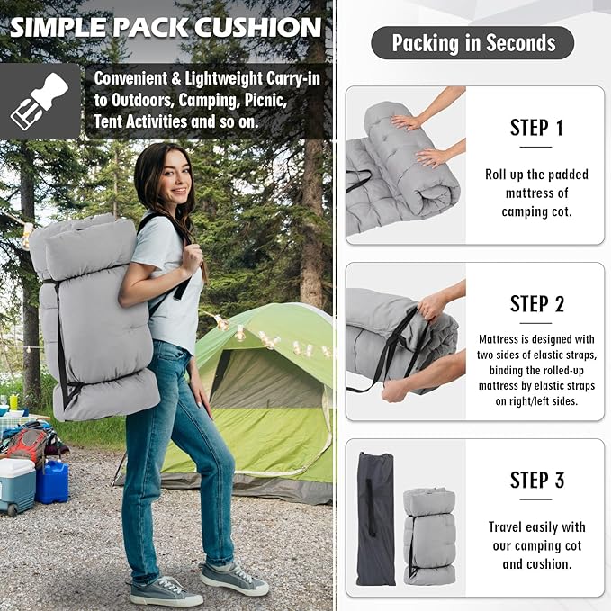 • Comfortable Rest Experience: Our camping cot features a padded pillow, which supports your head and suits human curvature.Relaxing your shoulders, neck, head and waist. Additionally, we also provide you a removable and soft mattres, which is made of skin-friendly fabric and soft filling, suitable for the most of people to use it, you also can remove the pad when the weather is hot.
