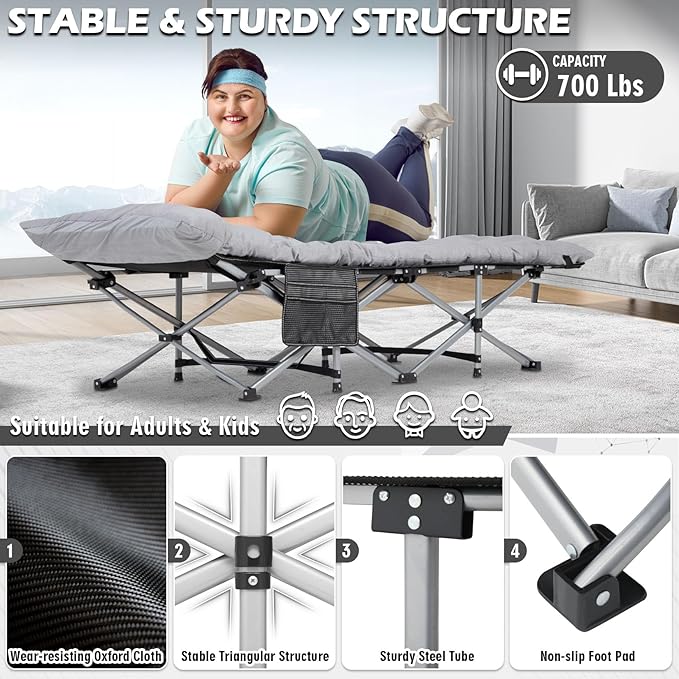 • Premium Material & Stable Structure: Our portable cot bed is constructed in double-layer oxford cloth to offer superior strength, which is wear resistance and easy cleaning. Because of selected and premium fabric, using our camping cot silently without squeak when rolling over at resting time. Besides, our folding cot is equipped with high-strength steel tube, supporting up to 700lbs, and also features X-shape structure to enhance stability, it can carry 1 adult or 2 children sleeping or resting on it.