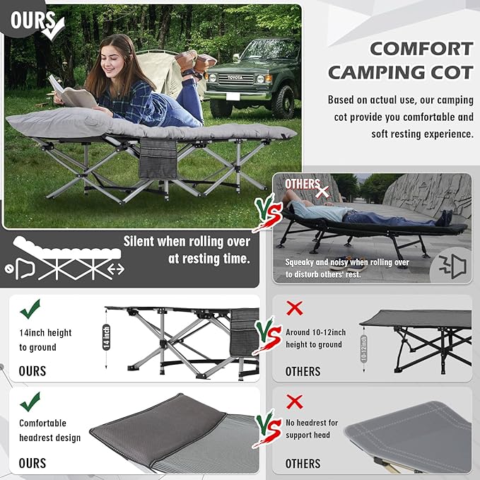 • Spacious Sleeping Area & Appropriate Height: Our folding cot has 28'' extra width for an adult to have a cozy sleeping and resting. When turning over, enough sleeping area to not worry about falling off the bed. Owing a special tilt design at the head of the bed, about 15 degrees inclining, let us to lie flat with a certain tilting, providing you the more comfortable sleep and rest. Besides, our camping bed is 14 inches off the floor, so that you will not feel short and uncomfortable when sitting next to the bed.