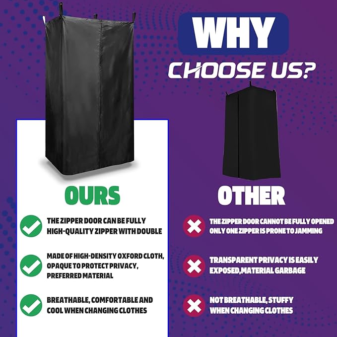 • Long Zipper Design: The inner layer of the changing room fabric adds shading fabric, and the double pull heavy-duty zipper makes the curtains easy to open or close, always keeping them vertical to prevent the tent from tipping over due to strong winds.