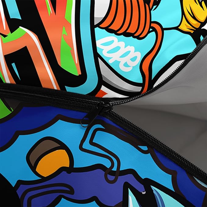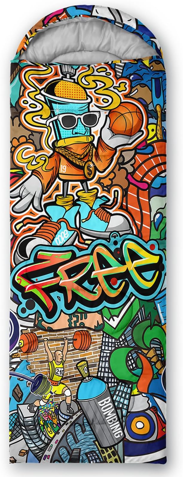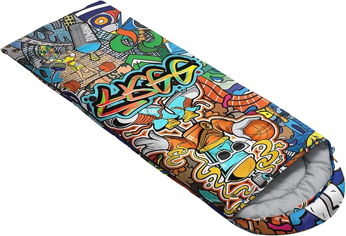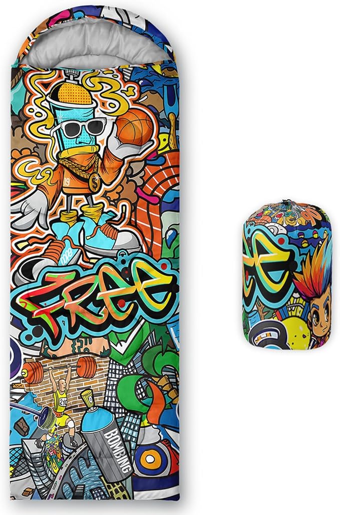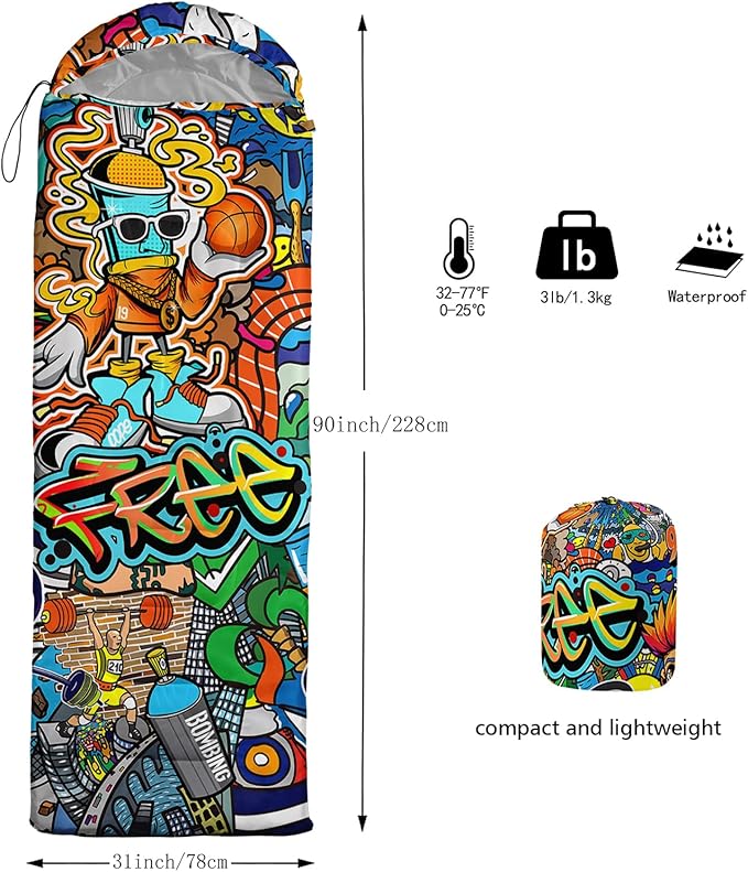 • Unique Hip Hop Design:This Hip Hop pattern sleeping bag is made of 3D digital printing with vibrant colors and patterns,size: 31W x 90L inches,temperature range: 32℉-77℉ (0℃-25℃),it also also have a weather resistant waterproof design to keep you warm and prevent you from any dampness,can be used in 3 seasons