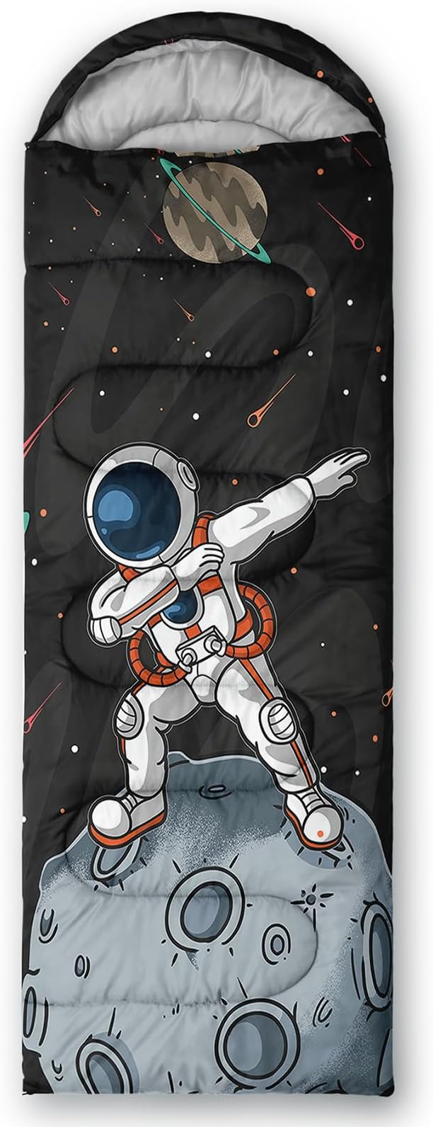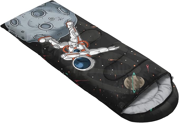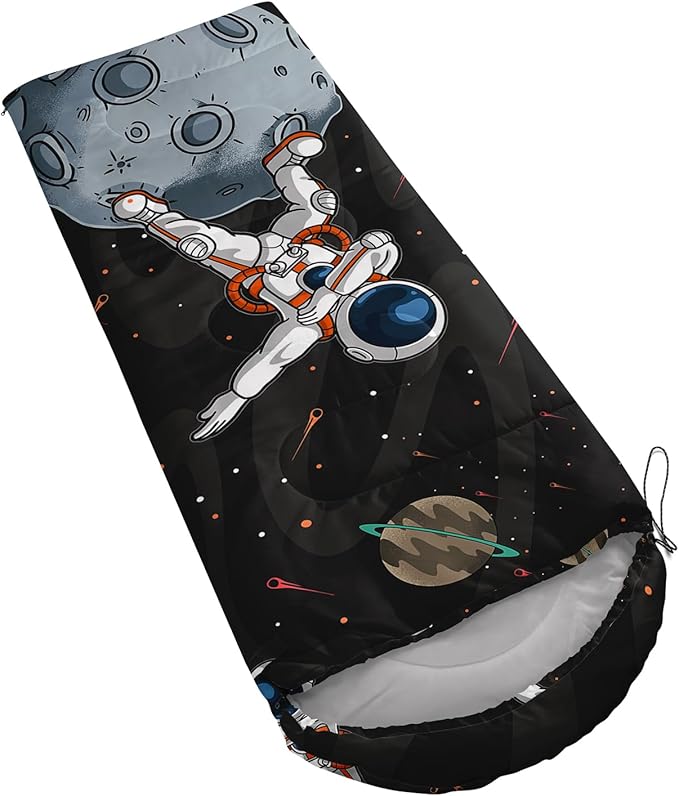 • Unique Astronaut Design:This Astronaut pattern sleeping bag is made of 3D digital printing with vibrant colors and patterns,size: 31W x 90L inches,temperature range: 32℉-77℉ (0℃-25℃),it also also have a weather resistant waterproof design to keep you warm and prevent you from any dampness,can be used in 3 seasons