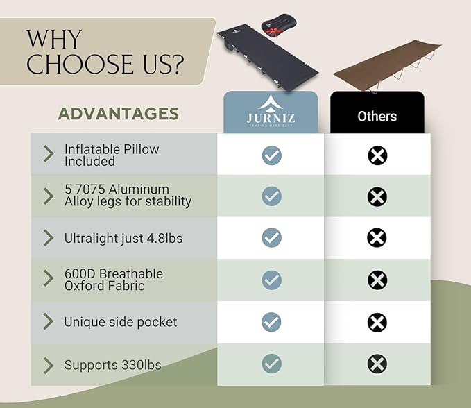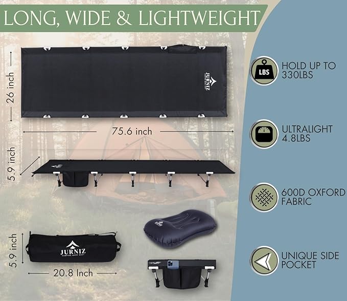 • đŸ’€ AN INCREDIBLE NIGHT’S SLEEP OUTDOORS: After a long, hard day of hiking through thick woods, conquering steep mountains and rugged terrains, you need and deserve a super comfortable night’s rest. The JURNIZ camping cot and camping pillow await, ready to transport you to dreamy sleep so you’re refreshed and energetic for tomorrow’s adventures.