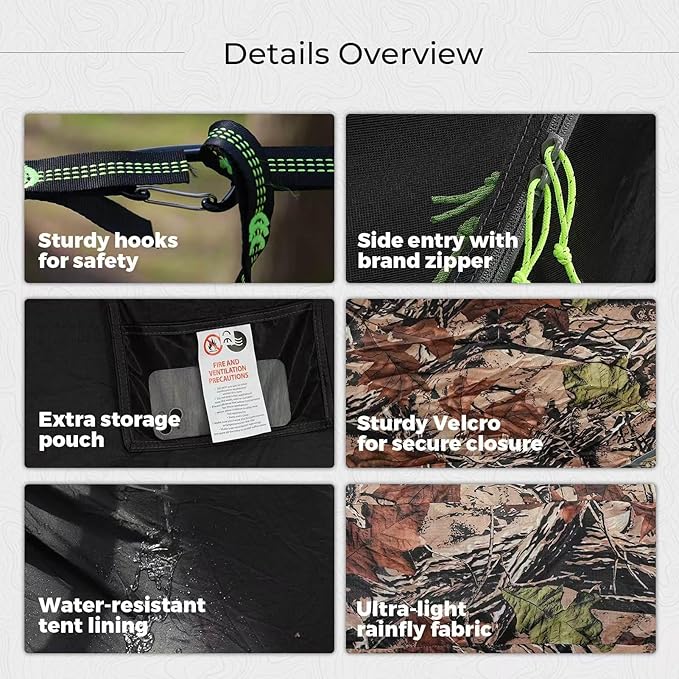 • Included Components : Tree Straps, Carabiners, Support Poles, Storage Bag, Rainfly