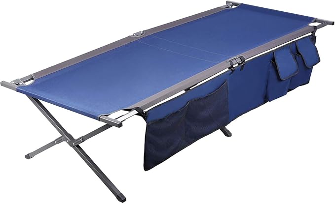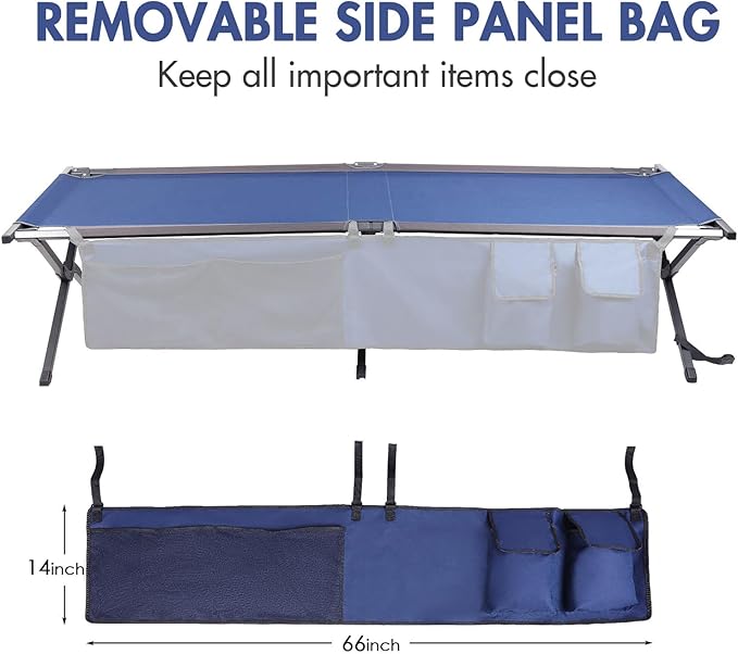 • PORTABLE AND EASY TO USE: This camping cots for adults can be quickly assembled or deconstructed thanks to two end braces and three scissor-action folding legs, making it easily portable for on-the-go adventures. It comes with an included carry bag, so you can take it with you anywhere.