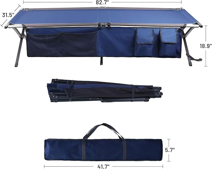 • PERFECT SIZE AND WEIGHT CAPACITY: With a weight capacity of 300 lbs., this camping cot measures 41.73" x 8.86" x 5.71" when collapsed and a generous 82.68” x 31.5” x 18.9” when fully assembled, providing a comfortable sleeping surface for adults of all sizes.