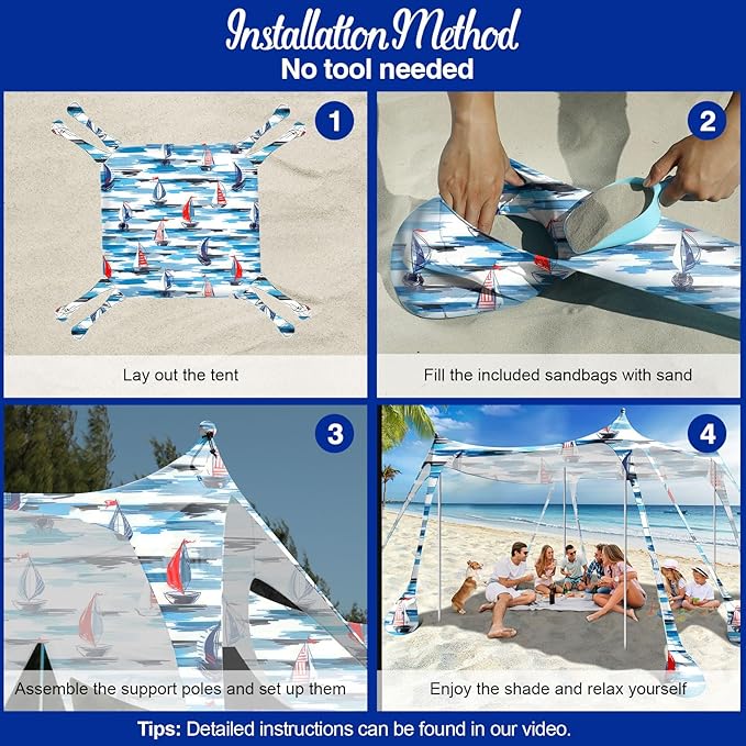 • 🔧【Quick and Easy Setup】It only takes a few minutes to set up and take down. Spread it out, then fill the sandbags, and add the poles. The included sand shovel is a nice bonus to fill 8 sandbags. Burying sandbags into the beach will make beach shelter more stable. One person can do it, making the outdoor beach day so easy and comfy!