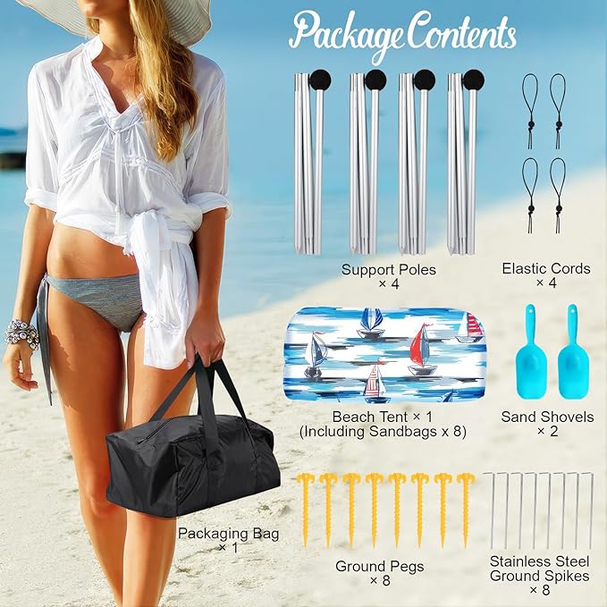 • 💨【Stands up to High Wind】Our upgraded beach tent sun shelter is equipped with 8 sandbags, 4 thickened aluminum poles and 4 windproof ropes, strong enough to withstand high beach winds, ensure stability and prevent collapse.