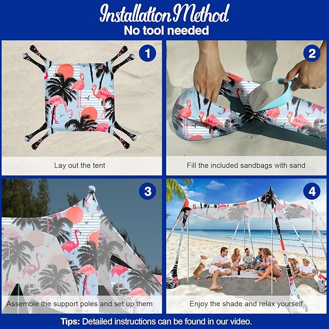 • 🔧【Quick and Easy Setup】It only takes a few minutes to set up and take down. Spread it out, then fill the sandbags, and add the poles. The included sand shovel is a nice bonus to fill 8 sandbags. Burying sandbags into the beach will make beach shelter more stable. One person can do it, making the outdoor beach day so easy and comfy!