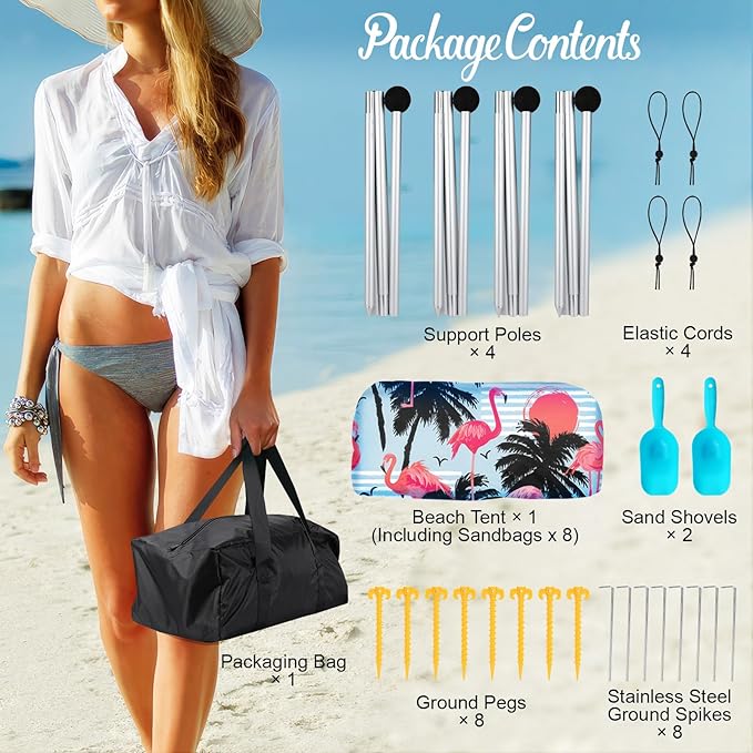 • 💨【Stands up to High Wind】Our upgraded beach tent sun shelter is equipped with 8 sandbags, 4 thickened aluminum poles and 4 windproof ropes, strong enough to withstand high beach winds, ensure stability and prevent collapse.