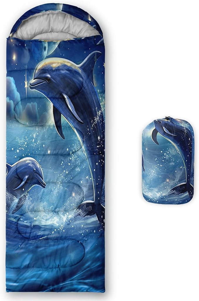 • Unique Dolphin Design:This Dolphin pattern sleeping bag is made of 3D digital printing with vibrant colors and patterns,size: 31W x 90L inches,temperature range: 32℉-77℉ (0℃-25℃),it also also have a weather resistant waterproof design to keep you warm and prevent you from any dampness,can be used in 3 seasons