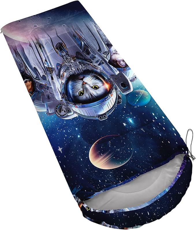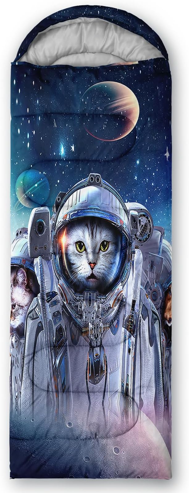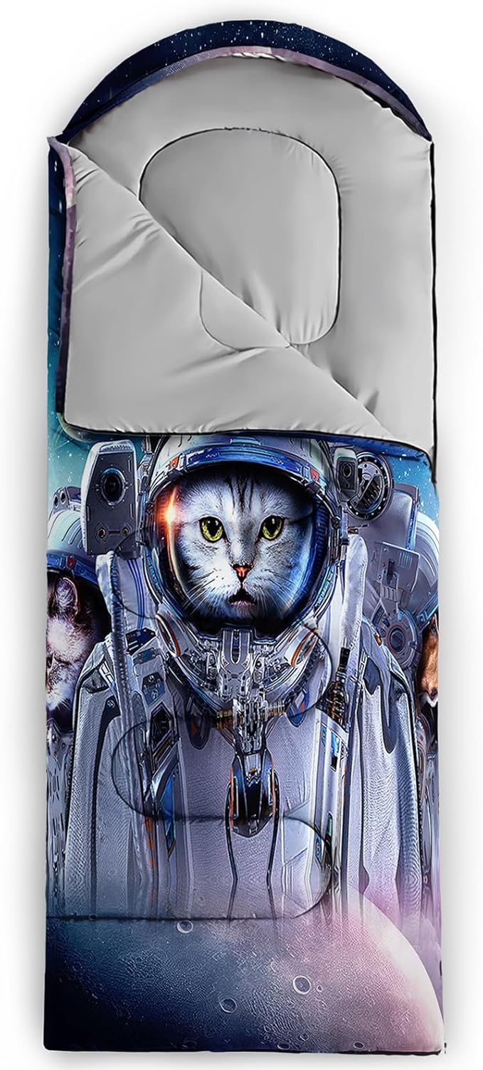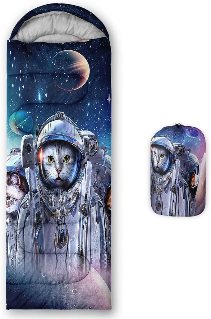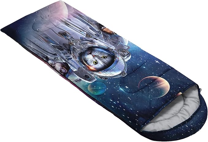 • Unique Cat Design:This Cat pattern sleeping bag is made of 3D digital printing with vibrant colors and patterns,size: 31W x 90L inches,temperature range: 32℉-77℉ (0℃-25℃),it also also have a weather resistant waterproof design to keep you warm and prevent you from any dampness,can be used in 3 seasons