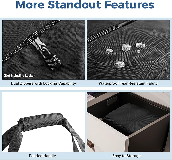 • Made of Sturdy, water-resistant 600 denier fabric material with premium heavy duty metal SBS 2-way lockable zippers(Not Including Locks). The padded shoulder strap for total comfort, the sturdy polyester body makes this duffle bag ideal for long-term use