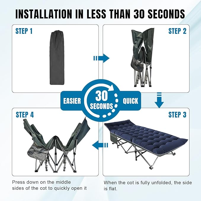 • Easy setup: The folding camping cot can be set up quickly and easily. It can be used unfolded or folded up in seconds. (Note: Press on the cot's middle to flatten it.) Put it in the included carrying bag to store it at home or in your car. If you have any questions, please contact us, and we will help you