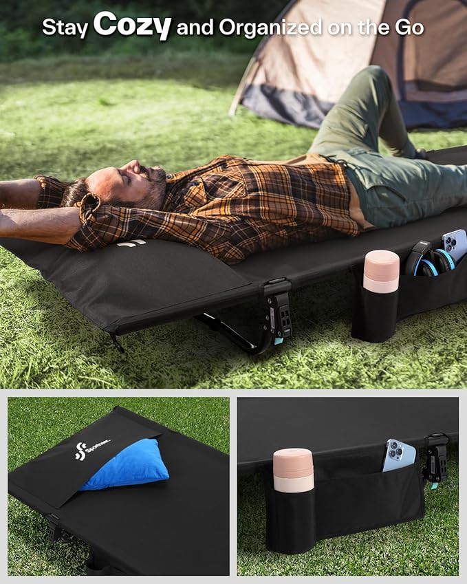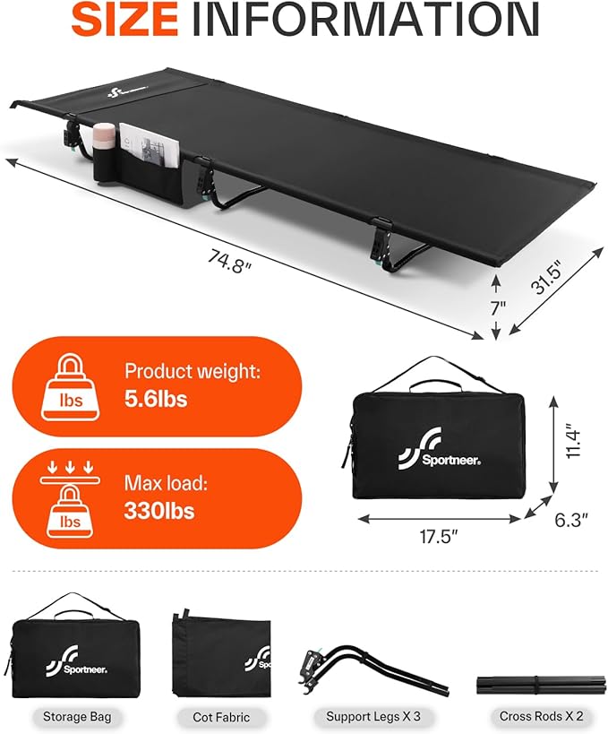 • Personalized Pillow Pocket and Side Pockets: The Sportneer camping cot features a personalized pillow pocket (pillow not included) and side pockets for easy access to essentials like water bottles and phones. Whether you're on the go or at camp, you'll appreciate the thoughtful comfort and convenience of this lightweight cot, making your outdoor adventure worry-free.
