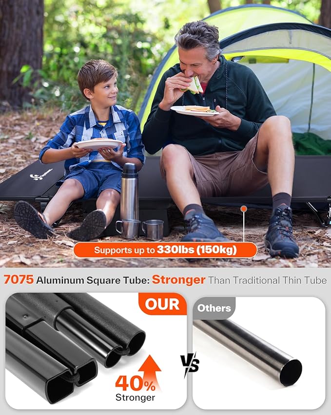 • Innovative, Sturdy Design: Reinventing durability and stability, this camping cot features aerospace-grade 7075 aluminum square tubes, which distribute weight more evenly than traditional round tubes, improving strength by 40%. Weighing just 5.6 lbs, this ultralight camp cot can support up to 330 lbs, ensuring unmatched stability whether you're sleeping or sitting with a companion.