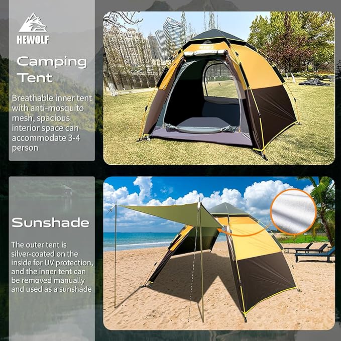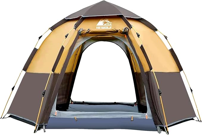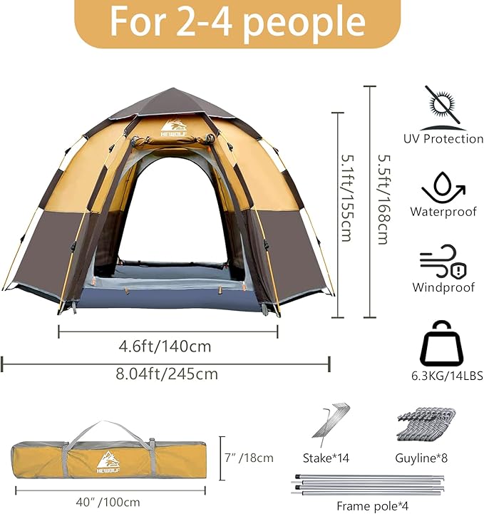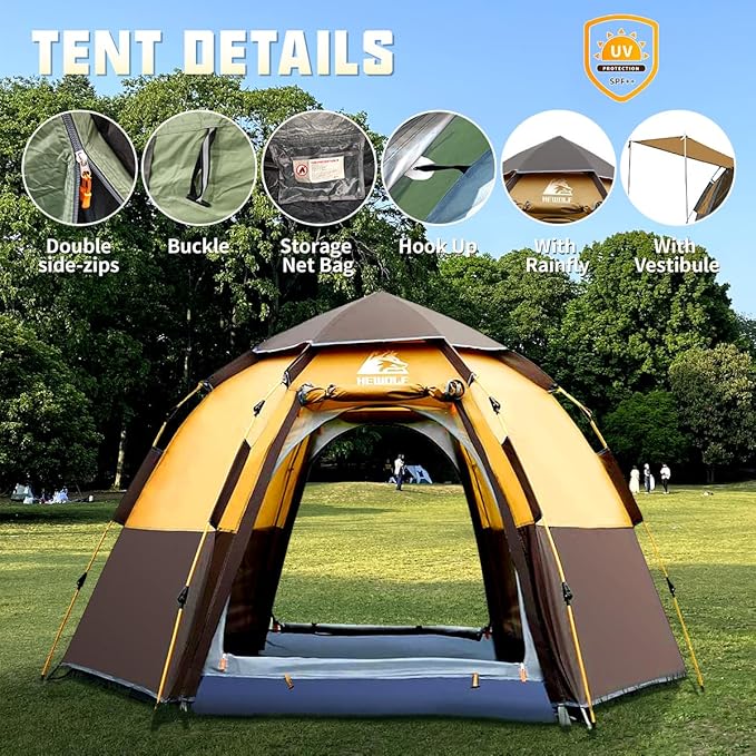 Hewolf 2/3/4 Person Camping Tent - Instant Pop Up Waterproof 2 Doors Tent with Easy Setup | 3-Season Hexagonal Dome Design for Family, Hiking & Traveling