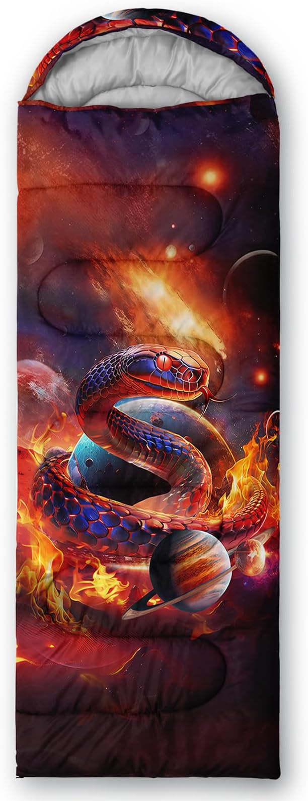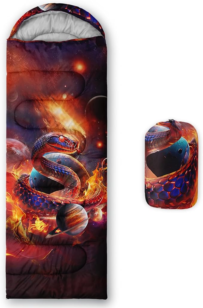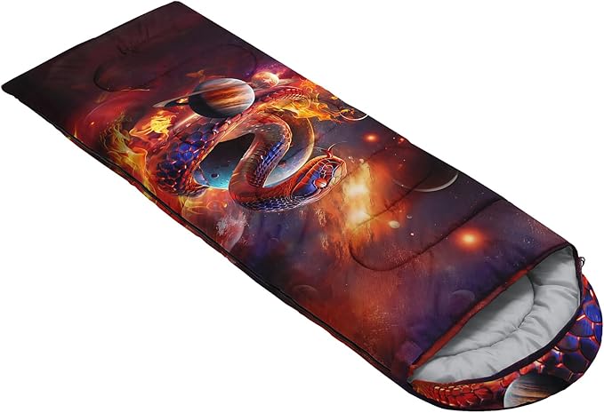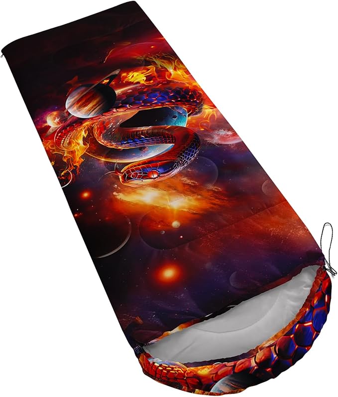 • Unique Snake Design:This Snake pattern sleeping bag is made of 3D digital printing with vibrant colors and patterns,size: 31W x 90L inches,temperature range: 32℉-77℉ (0℃-25℃),it also also have a weather resistant waterproof design to keep you warm and prevent you from any dampness,can be used in 3 seasons