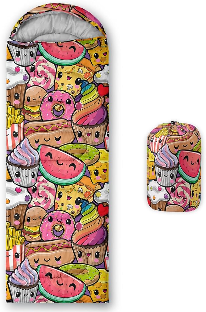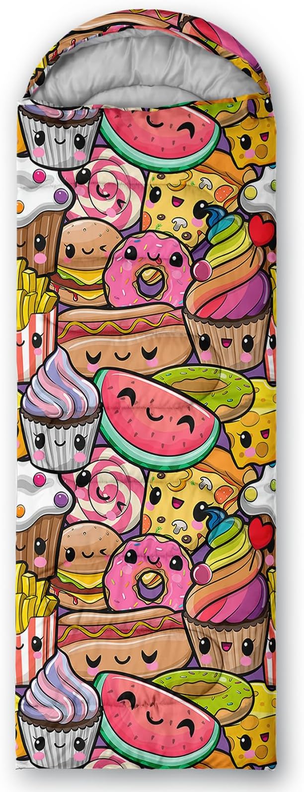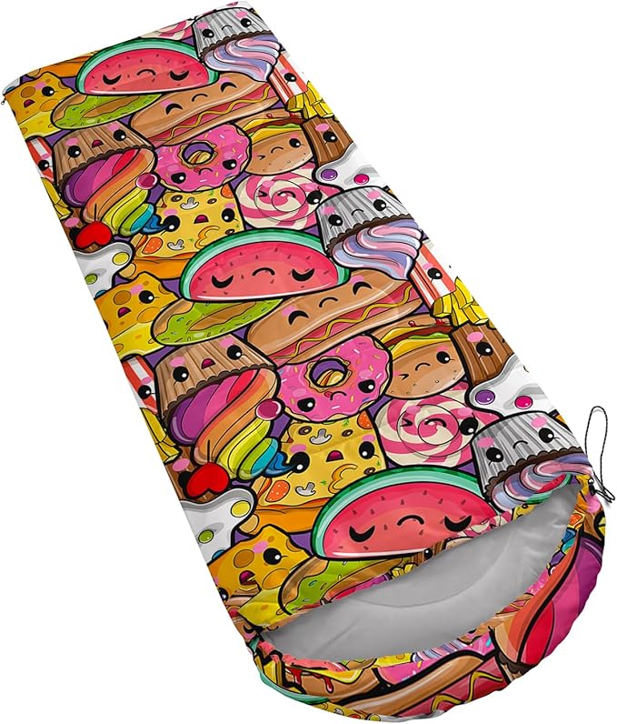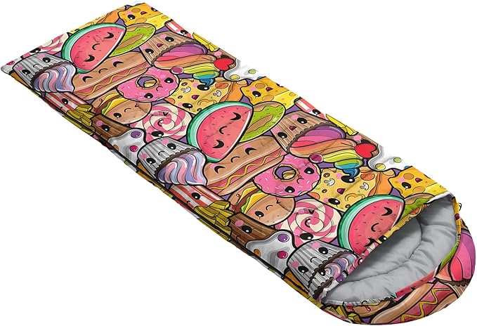 • Unique Cartoon Design:This Cartoon pattern sleeping bag is made of 3D digital printing with vibrant colors and patterns,size: 31W x 90L inches,temperature range: 32℉-77℉ (0℃-25℃),it also also have a weather resistant waterproof design to keep you warm and prevent you from any dampness,can be used in 3 seasons