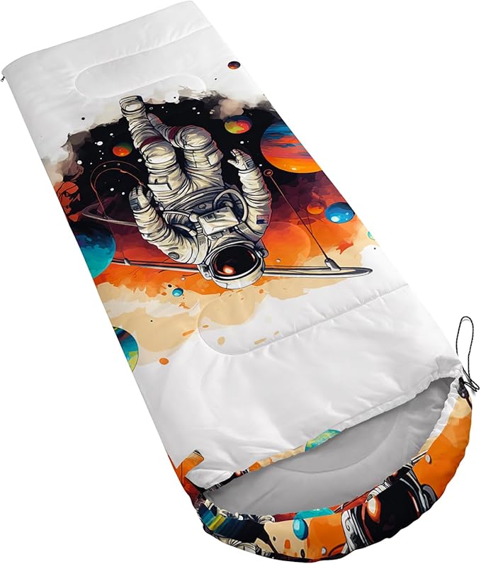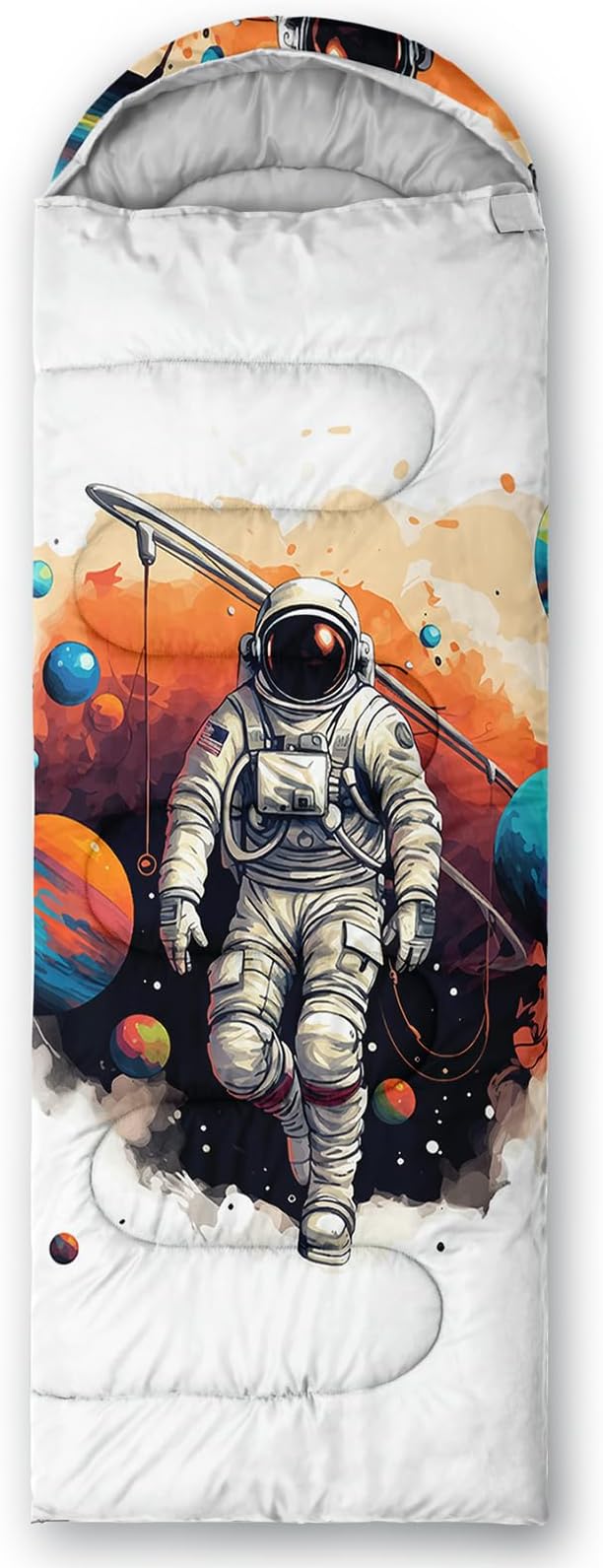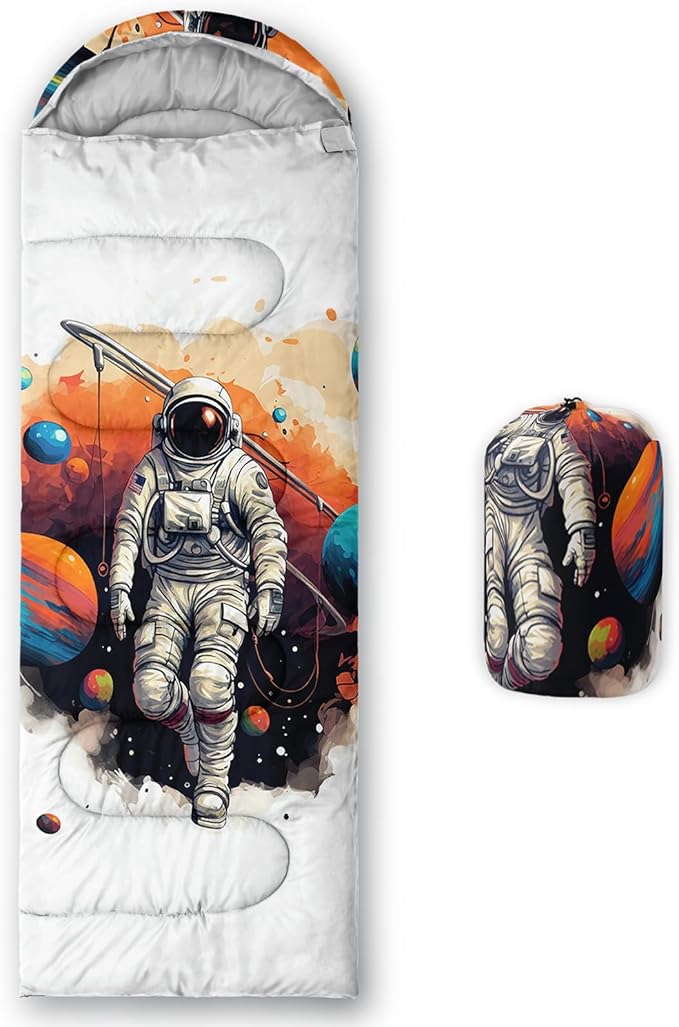 • Unique Astronaut Design:This Astronaut pattern sleeping bag is made of 3D digital printing with vibrant colors and patterns,size: 31W x 90L inches,temperature range: 32℉-77℉ (0℃-25℃),it also also have a weather resistant waterproof design to keep you warm and prevent you from any dampness,can be used in 3 seasons
