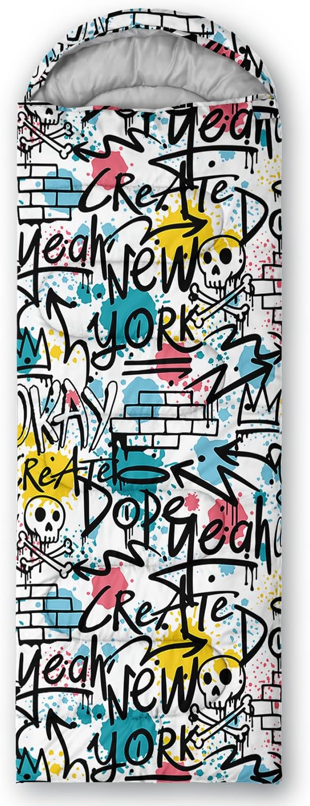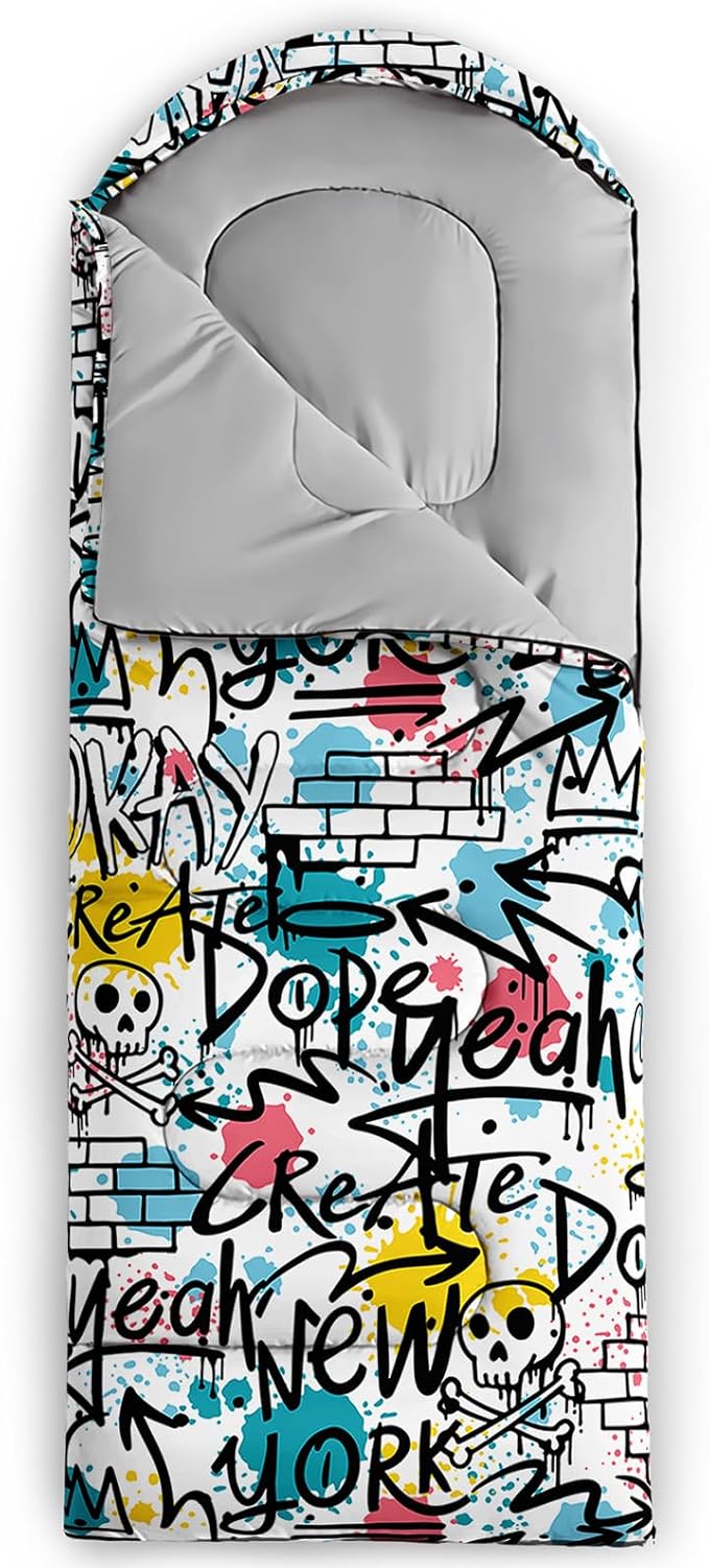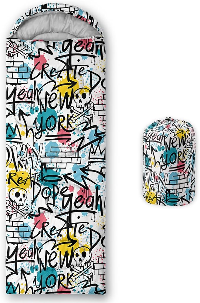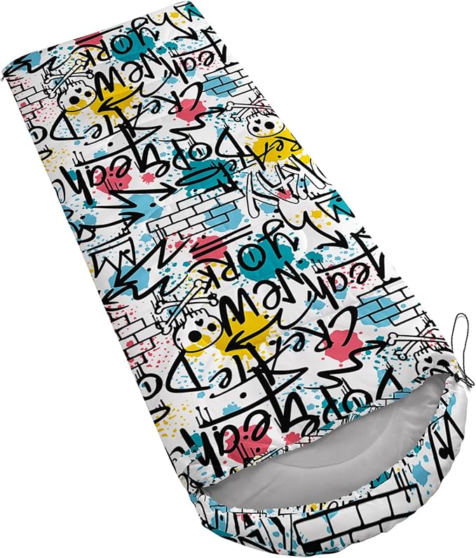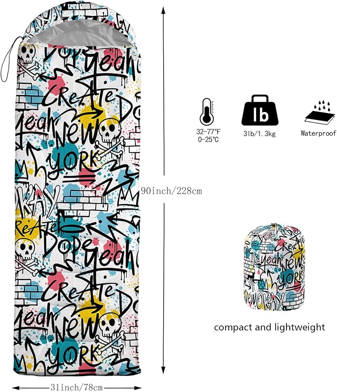• Unique Hip Hop Design:This Hip Hop pattern sleeping bag is made of 3D digital printing with vibrant colors and patterns,size: 31W x 90L inches,temperature range: 32℉-77℉ (0℃-25℃),it also also have a weather resistant waterproof design to keep you warm and prevent you from any dampness,can be used in 3 seasons