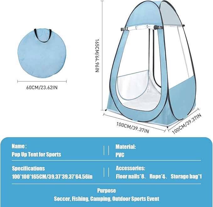 • 【Portable & Multipurpose】The pop up tent can be easily folded to a size of 23.6"L x 22"W x 1.57"H and stored in the included carrying bag to form a compact and lightweight package suitable for camping, beaches, forests, picnics and fishing. This sports tent set includes a sports tent, 8 ground studs, 4 ropes, and a handheld diagonal bag. Sports tent can be used as a shower tent, or sun shade, and is an ideal solution for sports fishing, camping, and hiking.