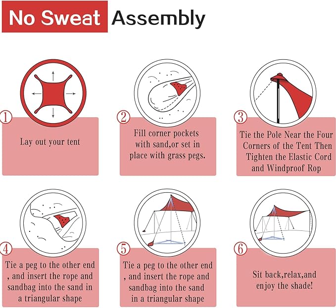 • STABILITY FEATURE:The beach shade canopy is supported by four aluminum poles (diameter 0.75 inch) and four large sandbags, along with 4 windproof ropes. They form a stable triangle that makes the tent highly wind-resistant.