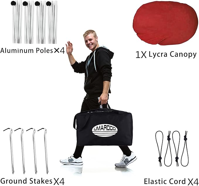 • DURABLE BEACH SHADE CANOPY: The strong and elastic Lycra fabric has UPF 50+ protection and water-resistant function. Rust-proof aluminum poles are attached with a elastic cord preventing moving.