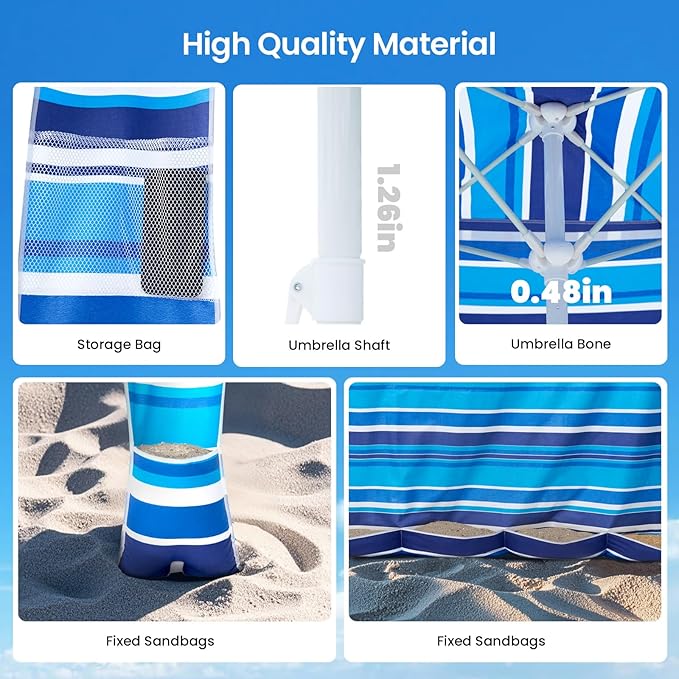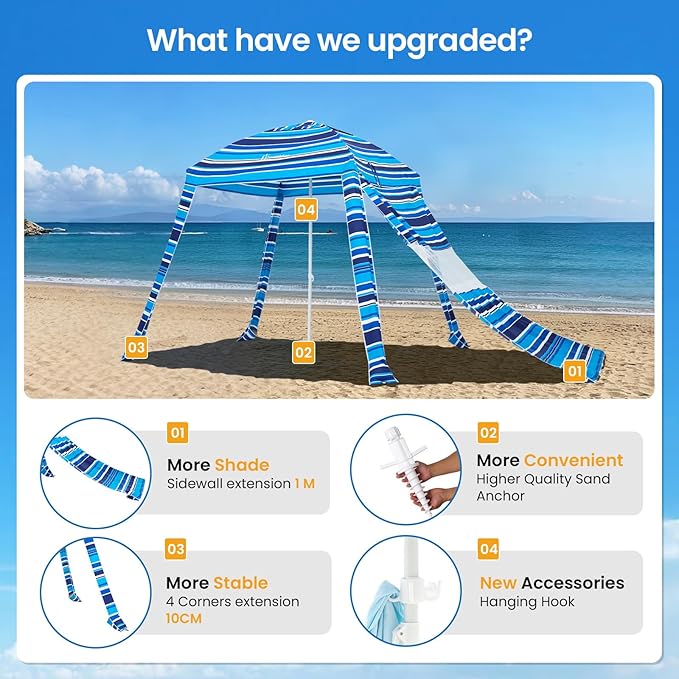 • 【Enhanced Stability & Shade Coverage】2025 Upgraded Beach Cabanas for Sand– Extended sidewalls and 4 reinforced corners significantly improve stability while expanding shade area. The sand anchors with spiral screws ensure effortless installation and firm grip on any beach terrain.