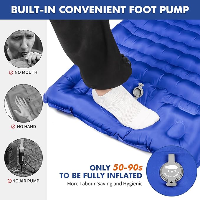 • 🏖️【Quick Inflation & Deflation】Simply foot stomp to inflate, allowing you to inflate your campping sleeping pad within 2 mins only and also avoids introduce moisture into the interior by mouth blowing. And the deflation valve has the double-decked design with a multi-functional which is used for fast deflating.