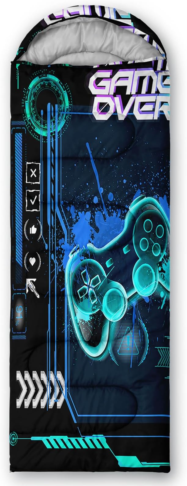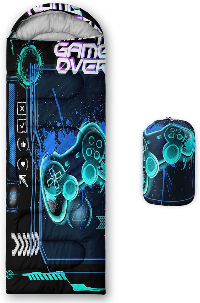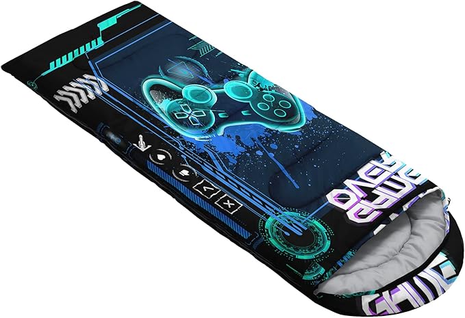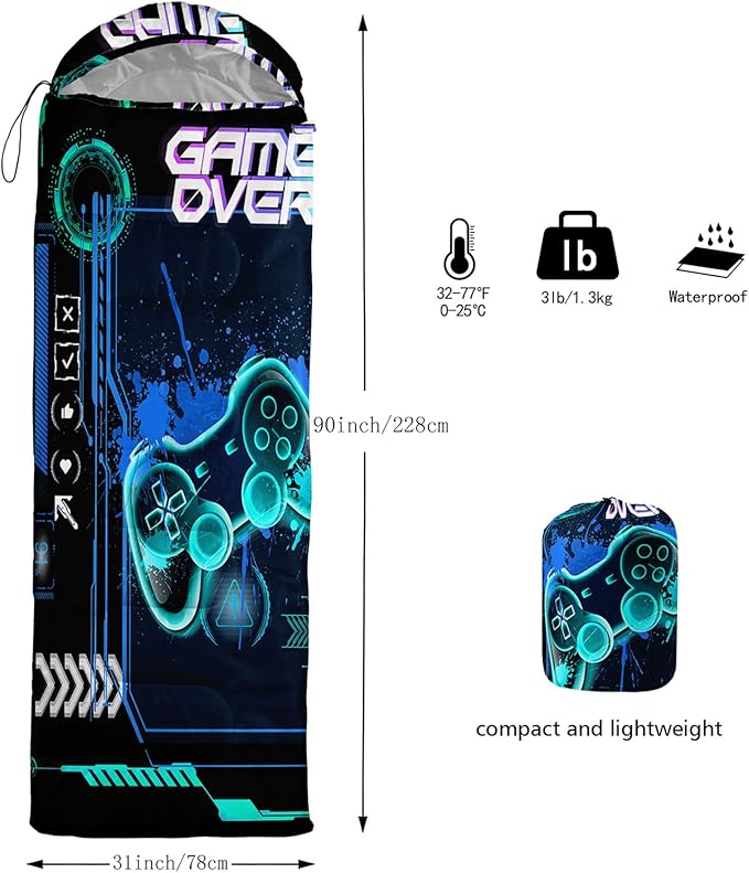 • Unique Gaming Design:This Gaming pattern sleeping bag is made of 3D digital printing with vibrant colors and patterns,size: 31W x 90L inches,temperature range: 32℉-77℉ (0℃-25℃),it also also have a weather resistant waterproof design to keep you warm and prevent you from any dampness,can be used in 3 seasons