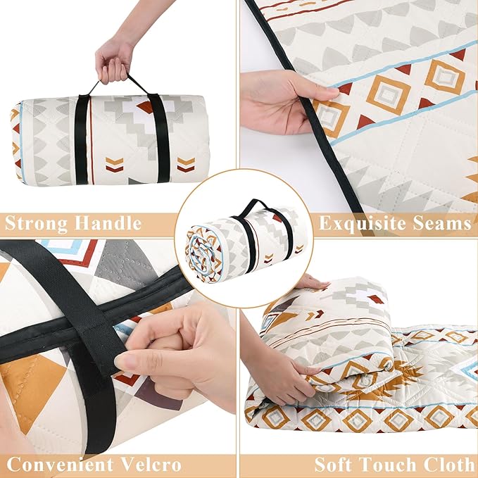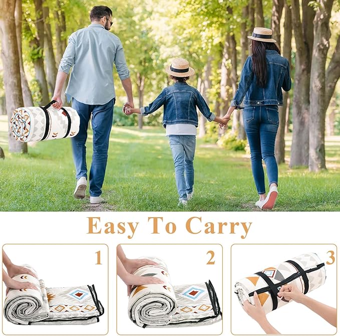 • Foldable and Lightweight Camping Blanket: XL picnic blanket can shrink down to a very portable size of 15''x 7''. With the help of the velcro, it will not loose easily and take too much space. The weight of the mat is only 2.7lbs, you can fold it with simple steps, carry or store it anywhere you want