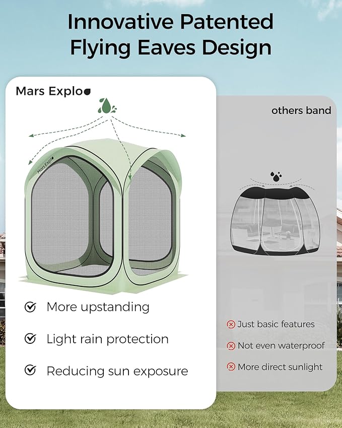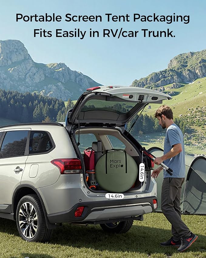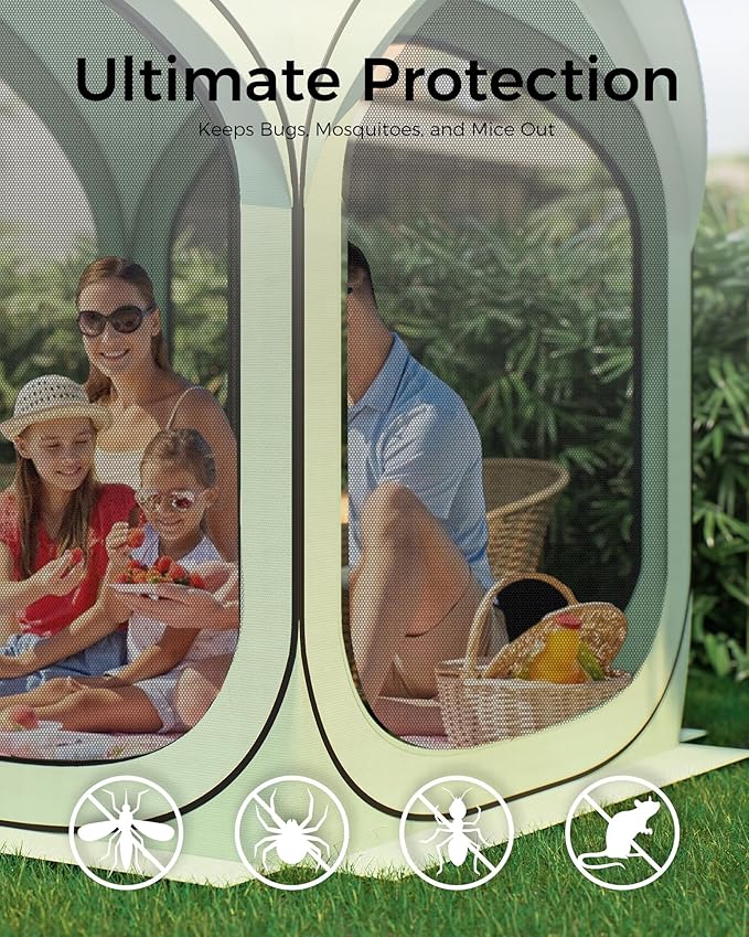 • Versatile & Comfortable Outdoor Experience: Perfect for various outdoor settings, this screen tent is great for relaxing in the backyard, hosting outdoor parties, or camping. It includes a hook for hanging lamps, allowing for extended use into the evening. The breathable design ensures comfort, while the mesh doors provide easy access and extra ventilation.