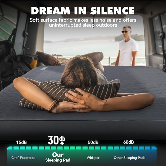 • WHISPER-QUIET NIGHTS UNDER STARS - Our camping mat with stretch-knit fabric surface combines whisper-soft comfort with noise-free movement. No more crinkly plastic sounds ruining your wilderness zen! Roll over freely without waking tent mates - Our foam sleeping pad is ideal for light sleepers and family camping trips where peaceful sleep matters most.