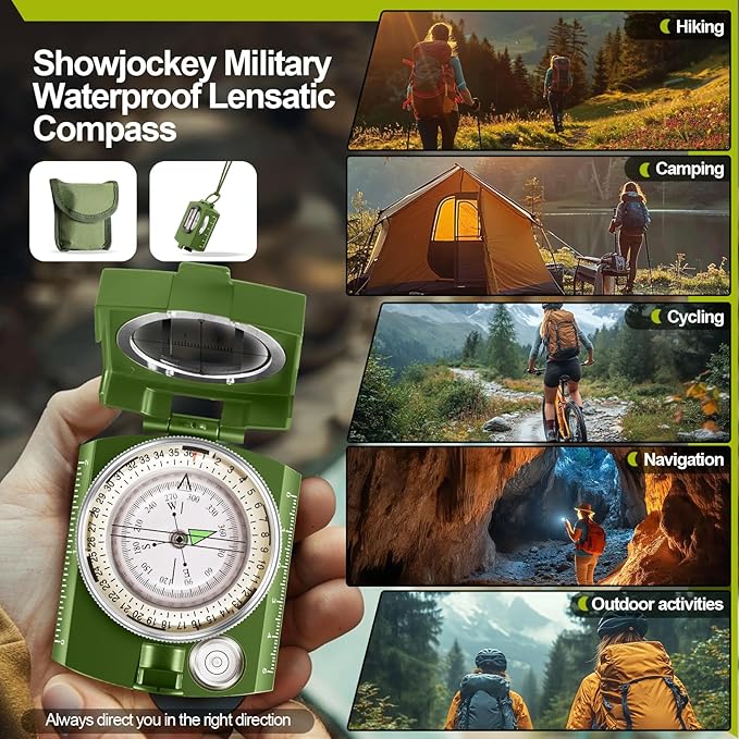 Compass Hiking Survival Military Grade for Hiking, Camping, Map Navigation, Showjockey Waterproof Lensatic Tactical Survival Compass with Pouch & Lanyard, Lightweight