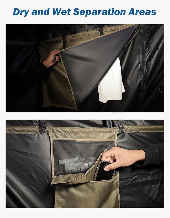 • Dry and Wet Separation Areas: Equipped with designated areas to separate dry and wet zones, this camping shower tent ensures that clean clothes and belongings remain dry. Internal storage pockets also feature dry-wet separation, making it convenient to keep personal items organized and moisture-free