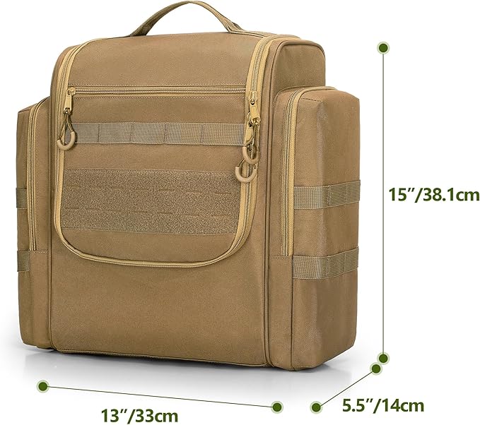 • Outstanding Designs: Khaki lining helps you easy to find items in dim environments; paper towel holder is suitable for the outdoor use; solid webbing on front pocket and 2 side pockets add immobility; badges can be decorated in front magic tape