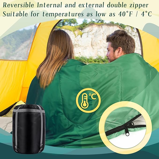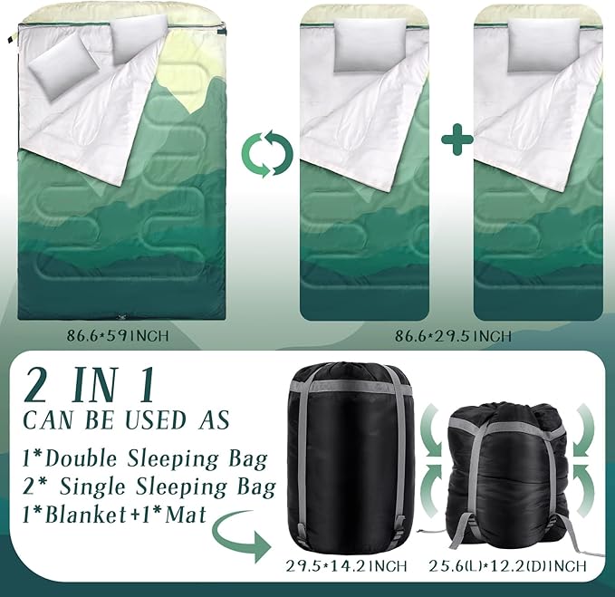 • Comfortable Sleep:our double sleeping bag with the wraparound zipper can be easily separated into 2 individual sleeping bags or transformed into 2 queen size blankets;Whether you're in outdoors or indoors,it will provide a comfortable sleeping experience