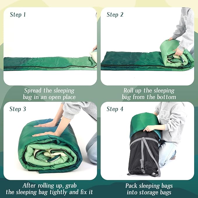 • Convenient Storage:the compression sack large opening makes it easy to store the sleeping bag without any damage;The portable handle on the sack ensures convenient transport for your outdoor adventures,camping trips,backpacking,hiking,or car tours