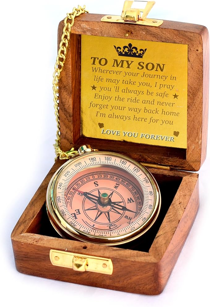 • MOM AND SON GIFT – A thoughtful and stunning gift from Mom to Son. Engraved compass makes a perfect Christmas gift for son, Wedding gift for son, Birthday gift for son, or College Graduation gift for son. The Compass is engraved with “To My Son Wherever Your Journey In Life May Take You I Pray You'll Always Be Safe”