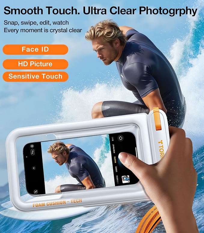 • Clear Photography, Sensitive Touch: Made of high-transparency 95A TPU, it ensures a high-definition effect like a bare phone. The independent "photography window" allows you to clearly capture every wonderful moment of water activities and record the underwater wonders during snorkeling; the "large window" gives you a crystal-clear screen and sensitive touch operation. You can easily edit messages, use Face ID, and make Facetime calls without removing your phone from waterproof bags