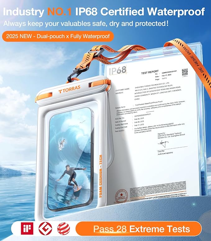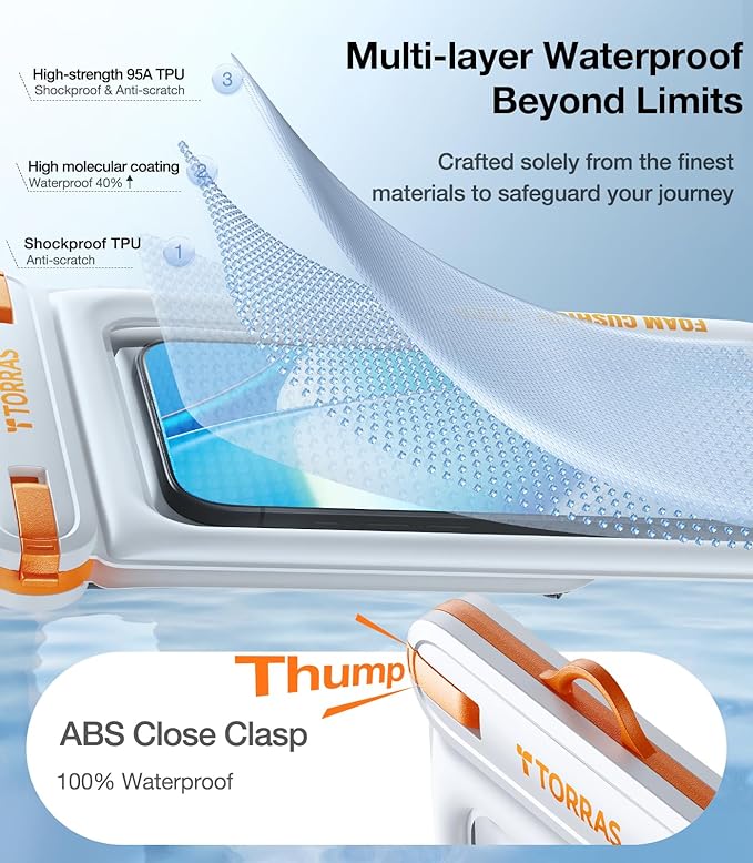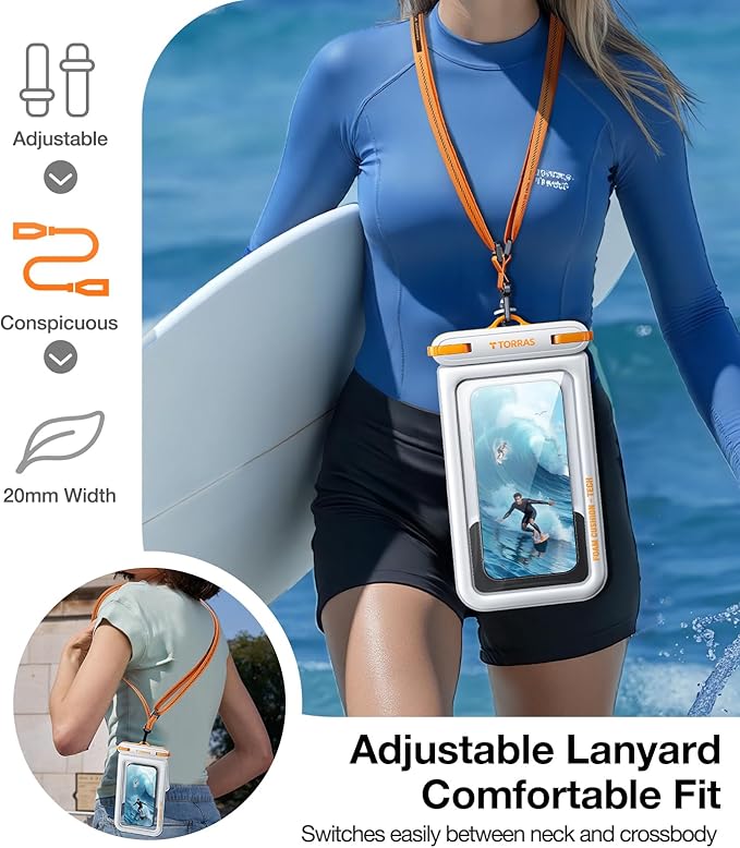• Dual Pouch, Double Storage: In 2025, TORRAS launched an innovative Dual-Pouch Waterproof Phone Pouch, providing double separate storage space. It keeps items neatly stored and solves the problem of daily items being messy and having no place to be put. The large pouch fits up to 7.0-inch phones. And the small pouch stores cards, cash, earphones, and keys, preventing phone-item scratches. Its white back design protects your privacy, allowing you to enjoy every happy journey without worry!