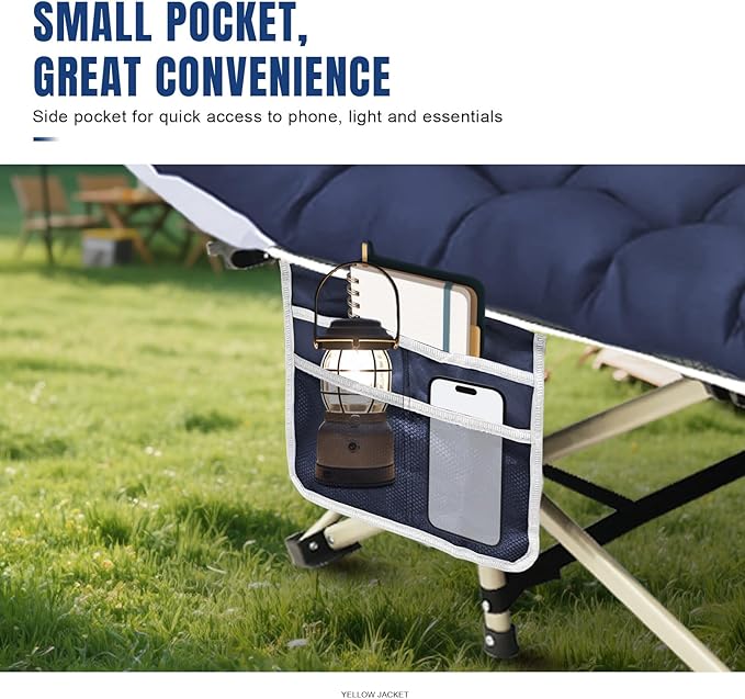 • Versatile cot camping with Storage: This folding cot bed features a large side pocket for phones, glasses, and essentials. Perfect for families and outdoor use, it's ideal for Camping, beach trips, Office naps, patio lounging, Road trips, travel. The compact foldable design with storage makes relaxation convenient anywhere.