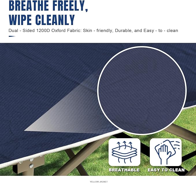 • All-Weather Durable Camp Cot: This foldable cot features double-layer 1200D Oxford fabric thatwithstands all seasons — breathable for summer use, and insulated for cooler weather. The tear-resistant material maintains comfort while being easy to clean, transitioning perfectly from backcountry adventures to guest room use year-round.
