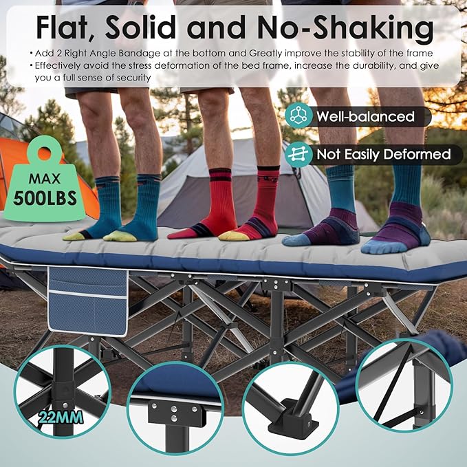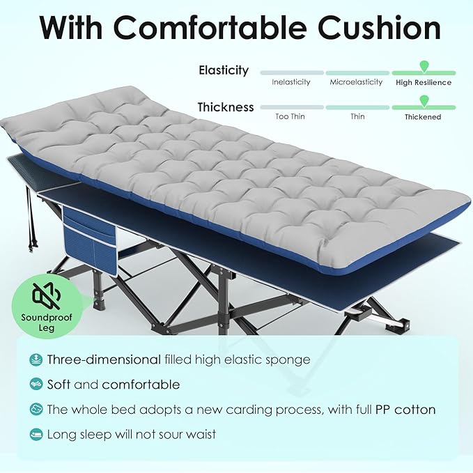 • 【Removable Skin-Friendly Mat】Our camping bed cot for adults has a soft and removable Mat, the 4" thicken cushion makes you more comfortable and warm when resting or sleeping. The cushion is made of skin-friendly and comfortable fabric, which is very suitable for people with sensitive skin or kids. You can also remove the mat when the weather is hot,and tie it up with the strap in it
