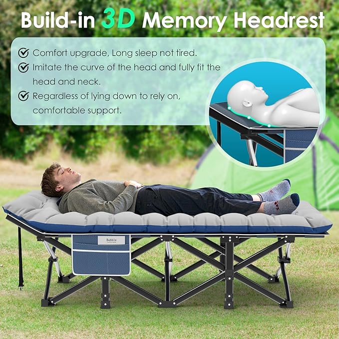 • 【Built-in Pillow Design】The headboard of our cot is a slanted design with built-in pillows, no need for extra pillows. The slight incline is ergonomically designed to ensure no more back, neck or shoulder pain in sleep! The mattress is also soft and thicker, so this is a very comfortable folding camping cot