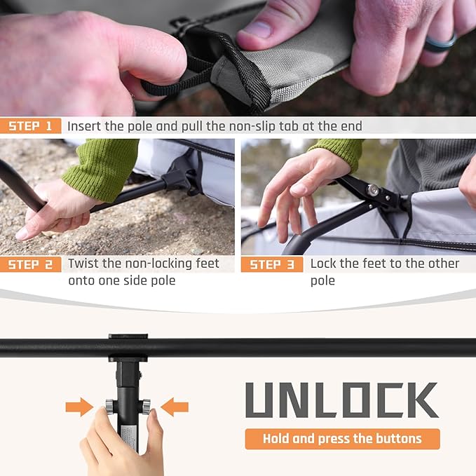 • Organized & Quick-access: camping cots for adults with roomy side pockets and MOLLE straps. The side pockets are detachable and can be moved to any seat of the side. You can keep your phone, books, water bottles, and other camp gear clean and dry. The MOLLE straps can attach camping essentials and giving you even more storage options within arm's reach.