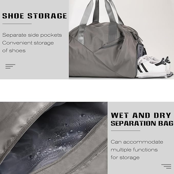 Gym Bag for Men & Women with Shoe Wet Compartment and Wet Pocket, Waterproof Sports Bags for Men, Weekender Overnight Bag, Sport Gym Tote Bags Swimming Yoga (Grey)