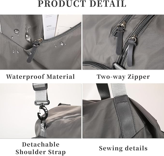 • Separate Shoe Compartment Design: The sport bag is equipped with a separate shoe compartment to help you put your shoes in the travel bag better. The shoe compartment allows you to easily store and access your gym shoes without dirtying the main compartment